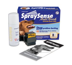 The SpraySense tm Anti-Bark Collar is the humane solution for problem barking. A harmless yet highly effective burst of spray interrupts barking and redirects behavior without painful consequences. The SpraySense Anti-Bark Collar offers the highest level of quality and reliability, wit a lifetime guarantee. Recommended by leading veterinarians, behaviorists, and trainers. For use with any breed of dog this is at least 6 months old and weighs 6 lbs. or more. Each package includes: anti-bark device (weighs2.5 oz.), 2.4 oz ca of hypoallergenic spray, adjustable nylon collar, 6-volt alkaline battery, detailed instructions and lifetime warranty. Please state if you want the citrus or scentless spray. |